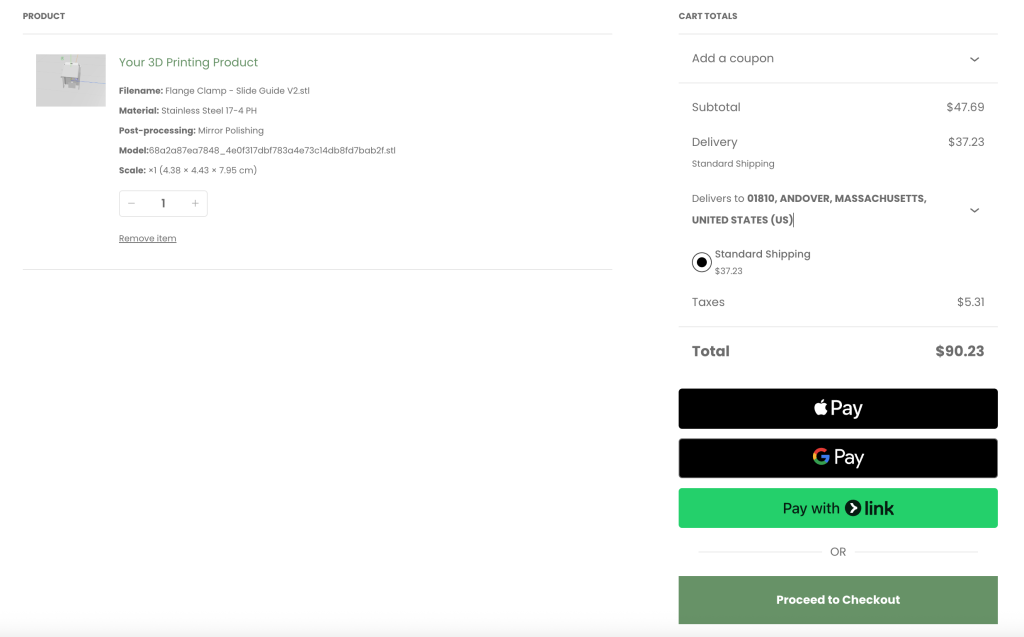 历时三个月,帮客户从0到1搭建完成了在线3D打印电商网站(WordPress + Woocommerce),客户可以在线上传 .STL .OBJ .STP, .STEP , .IGES等格式的3D文件,在线解析模型的 Dimensions,用户可选择打印机类型, Material, Coating, infill, post-processing, 最后根据客户选择动态计算价格, 加入购物车, 计算运费, 下单支付, 后台订单状态跟踪, 物流跟踪, 订单状态及物流信息实时推送客户的全链路在线3d打印服务。