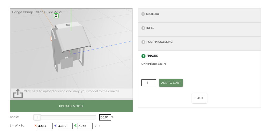 - 添加购物车:用户确认订单后,可将定制的 3D 打印服务加入购物车。购物车数量默认值为1,数量超过10的客户可启用联系客服以获得更优报价的按钮。